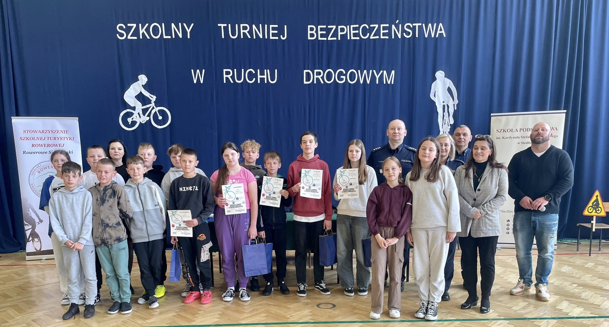16 maja 2025r. w naszej placówce odbył się Szkolny Turniej Bezpieczeństwa w Ruchu Drogowym. Celem turnieju było przede wszystkim popularyzowanie wiedzy i zasad z zakresu ruchu drogowego. Do zmagań stanęli uczniowie z klas IV- VIII. Podczas zawodów uczniowie brali udział w kilku konkurencjach. Wiedzę teoretyczną zweryfikowały testy z przepisów ruchu drogowego, a praktykę – konkurencje umiejętnościowe, tj. jazda na torze sprawnościowym. Turniej cieszy się niesłabnącą popularnością zarówno wśród uczniów, jak i wychowawców. Bardzo duży wkład w jego organizację mają policjanci, którzy pełnią rolę sędziów w konkurencjach. W tym roku byli to: nadkom. Katarzyna Masztak  i mł.asp. Andrzej Pajewski. Bardzo im za to dziękujemy!