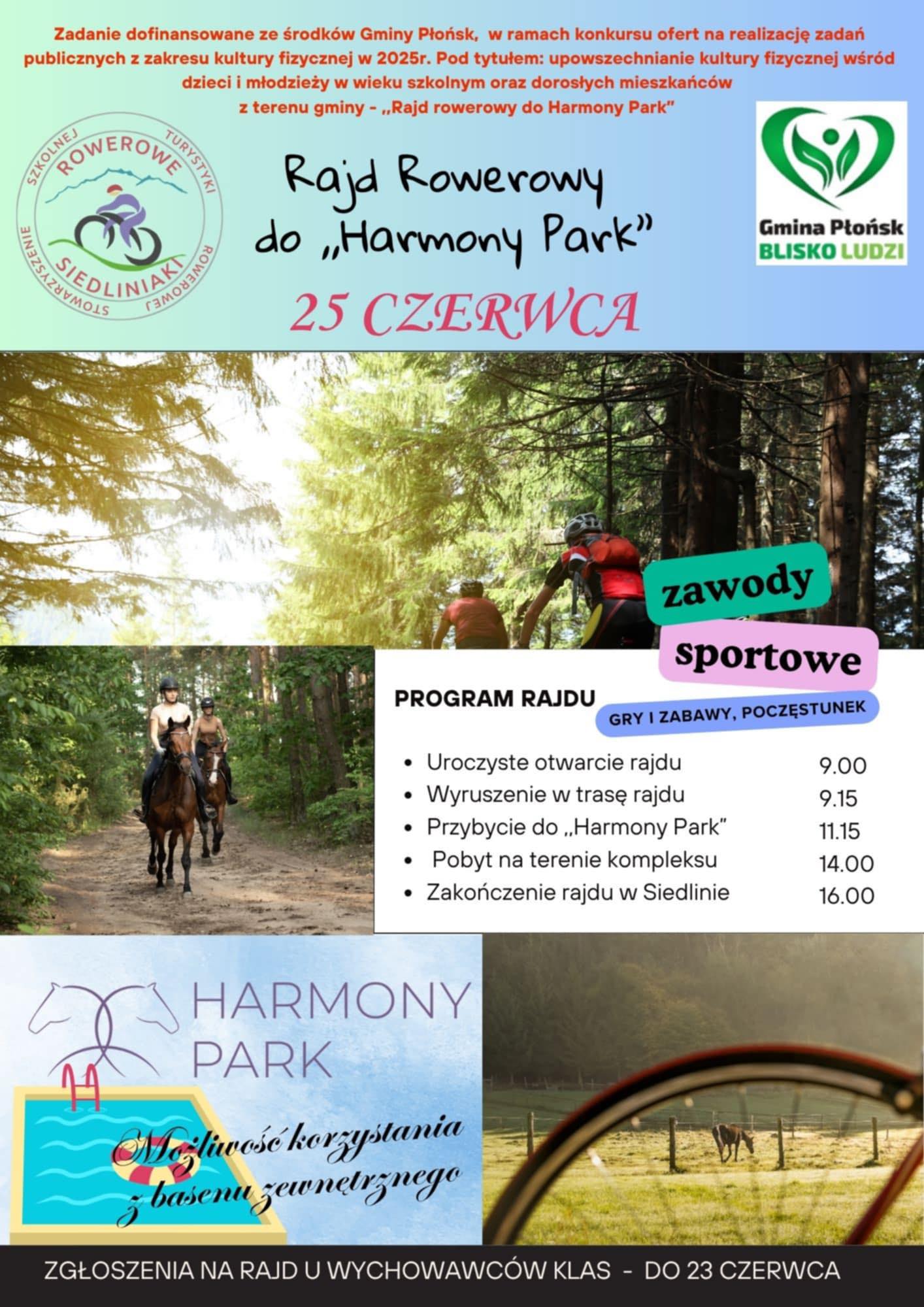 Zadanie dofinansowane ze środków Gminy Płońsk, w ramach konkursu ofert na realizację zadań publicznych z zakresu kultury fizycznej w 2025r. Pod tytułem: upowszechnianie kultury fizycznej dzieci i młodzieży w wieku szkolnym oraz dorosłych mieszkańców z terenu gminy – „Rajd Rowerowy do Harmony Park”.